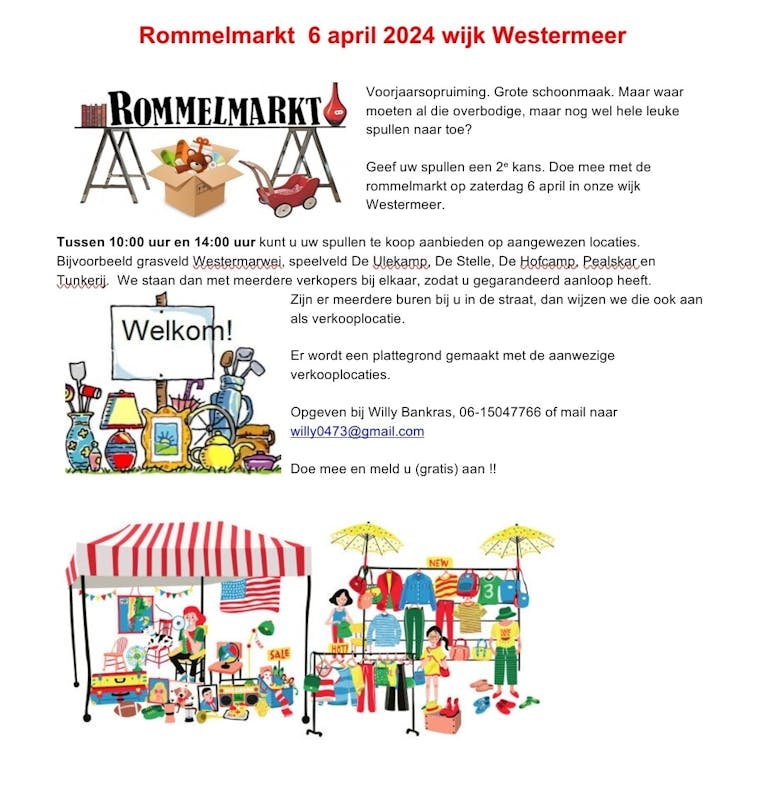 In de wijk Westermeer In Joure is er op zaterdag 6 april tussen 10:00 uur en 14:00 uur een rommelmarkt. Wil je ook je goederen verkopen? Iedereen is welkom. Meld je (gratis) aan bij . In de wijk zullen plattegronden aanwezig zijn, waarop alle verkooppunten zichtbaar zijn. Ook als bezoeker bent u van harte welkom.