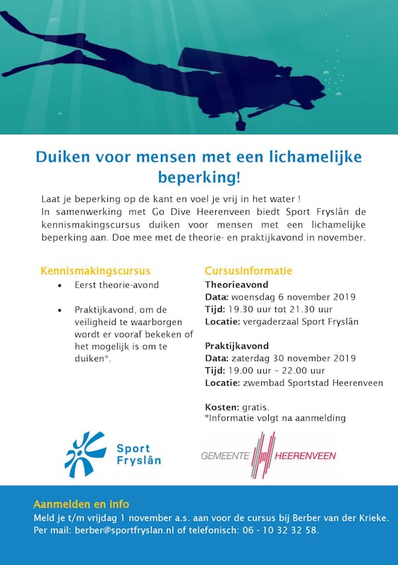 Go Drive Heerenveen biedt in samenwerking met Sport Fryslân een kennismakingscursus duiken aan voor mensen met een lichamelijke beperking. De cursus bestaat uit een theorie- en praktijkavond in november.
