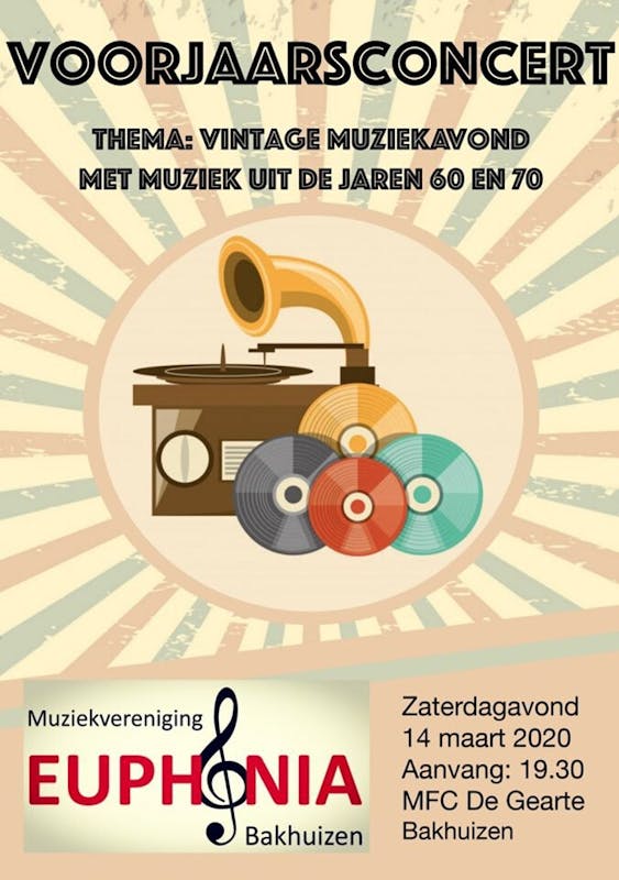 Op zaterdagavond 14 maart is het weer tijd voor ons jaarlijkse voorjaarsconcert! Het thema van dit jaar is 'Vintage Muziekavond'. Tijdens deze avond zal er muziek uit de jaren 60 en 70 te horen zijn. De fanfare speelt onder andere muziek van ABBA en bekende tv-hits. Ook hebben de majorettes weer prachtige shows ingestudeerd en zullen onze eigen leerlingen laten horen wat zij tijdens hun muzieklessen geleerd hebben. Jullie komen toch ook?!
