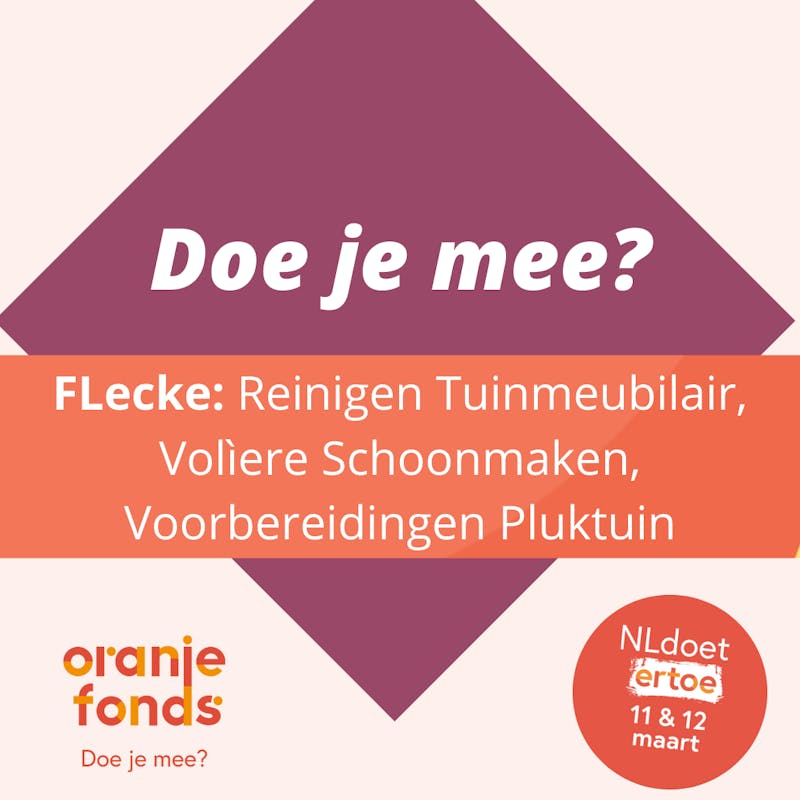 Het WoonZorg en behandelcentrum doet mee aan de landelijke actie: NLdoet van @oranje_fonds. Ze zoeken mensen die de Volière willen schoonmaken, zodat de vogels weer een prachtig schoon verblijf hebben. Ook het tuinmeubilair moet worden gereinigd zodat de bezoekers en bewoners kunnen genieten van de tuin. Daarnaast kunnen ze ook hulp gebruiken bij de voorbereidingen van de pluktuin. Genoeg keuze dus! Meld je direct aan via nldoet.nl