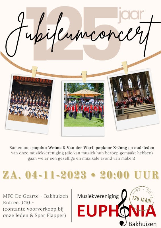 Op zaterdagavond 4 november vieren wij ons 125-jarig bestaan! Samen met popduo Weima & Van der Werf, popkoor X-jong en oud-leden van onze muziekvereniging (die van muziek hun beroep gemaakt hebben) gaan we er een gezellige en muzikale avond van maken! Na het jubileumconcert feesten we door op de afterparty met Weima & Van der Werf!