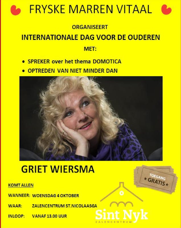 ‘Fryske Marren Vitaal’, vereniging van ouderen, voor ouderen, door ouderen, zal op 4 oktober a.s. de viering van de Internationale Dag voor Ouderen organiseren. Deze dag, bedoeld voor alle ouderen in de gemeente ‘De Fryske Marren’ is gratis toegankelijk.