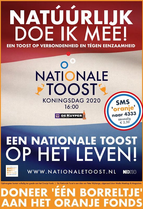 Daarom wordt de Nationale Toost, op Koningsdag, in heel Nederland tegelijkertijd uitgebracht door iedereen … op de gezondheid van iedereen. In huis, op de gang of overloop, op het balkon of dakterras, in je voor- of achtertuin, het maakt niet uit … schenk in en hef het glas!