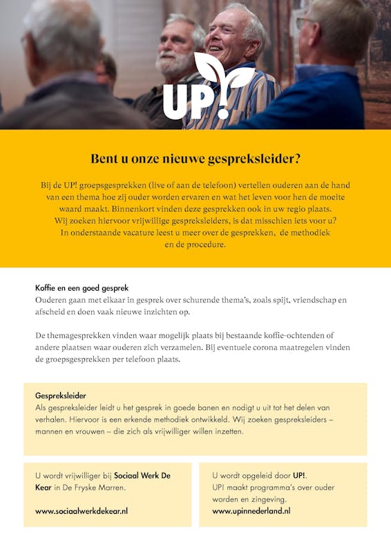 Sociaal Werk De Kear gaat UP! groepsgesprekken organiseren. Bij de UP! groepsgesprekken (live of aan de telefoon) vertellen ouderen aan de hand van een thema hoe zij ouder worden ervaren en wat het leven voor hen de moeite waard maakt. Binnenkort vinden deze gesprekken in De Fryske Marren plaats.
