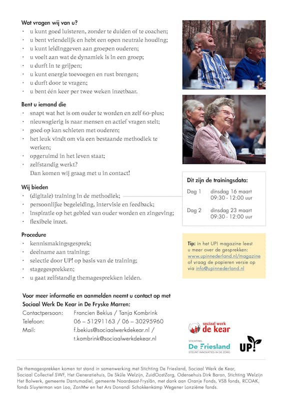In onderstaande vacature leest u meer over de gesprekken, de methodiek en de procedure. U wordt opgeleid door UP! (UP! maakt programma’s over ouder worden en zingeving. www.upinnederland.nl)