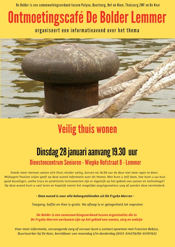 LEMMER - Het ontmoetingscafé De Bolder houdt dinsdag 28 januari weer een thema-avond. Het thema is deze keer ‘Veilig thuis wonen’.